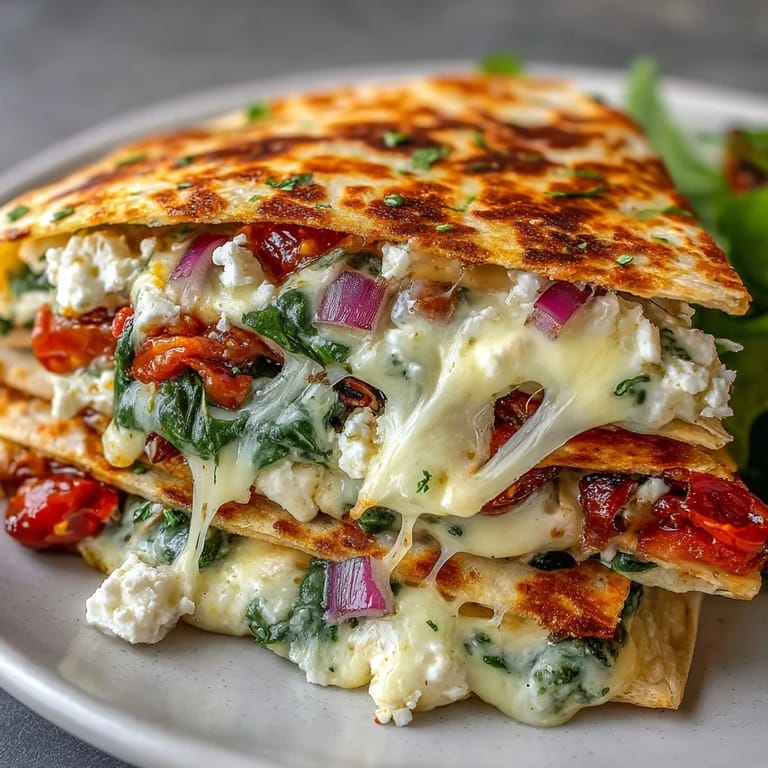 Save The first time I made these Mediterranean quesadillas was actually a happy accident on a Tuesday night when I was staring at a random collection of ingredients and refusing to make another grocery store run. My kitchen smelled like garlic and something unexpected was happening, and honestly, that spontaneous dinner turned into one of my favorite go-to meals ever since.