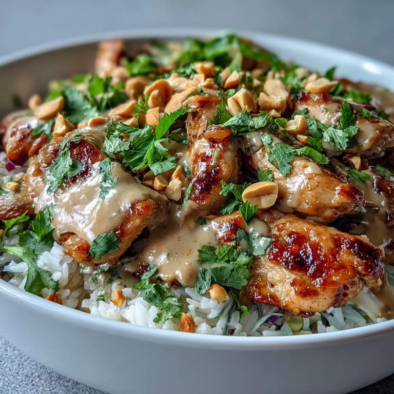 Save There's something about assembling a bowl that feels less like cooking and more like creating. I discovered this peanut chicken version on a Tuesday when I had leftover coconut milk, a craving for something bright, and exactly forty-five minutes before a work call. The combination of creamy rice, tender chicken, and that addictive peanut sauce came together so naturally that I've made it nearly every week since. What started as improvisation became my go-to answer for when people ask what I'm having for lunch.