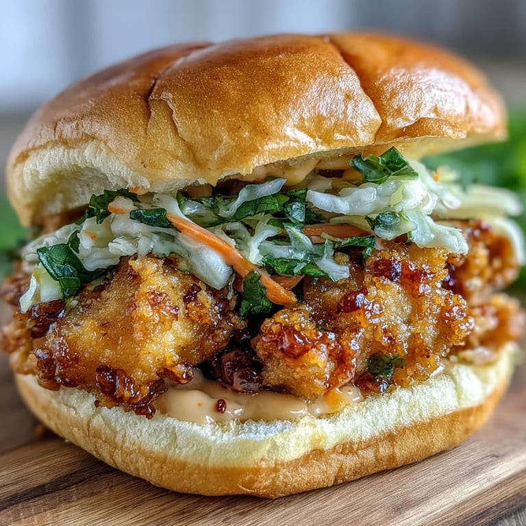 Save I was supposed to be meal prepping for the week ahead, but the red curry paste sitting on my counter sparked something else entirely. What started as a simple fried chicken experiment turned into the sandwich that made my roommate actually pause his video game and come ask what smelled so good. The combination of that aromatic marinade and the crunch of fresh vegetables just hits different on a Tuesday evening.