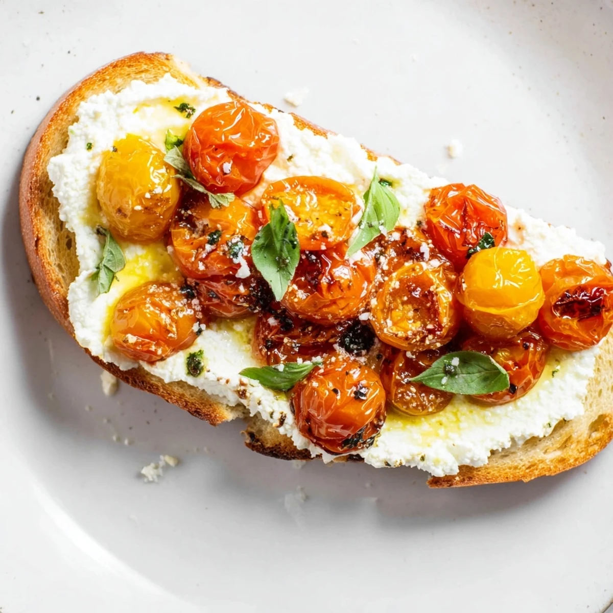 - Spread a thick, generous layer of whipped ricotta on each toast, then pile on the warm roasted tomatoes. Drizzle with more olive oil, scatter fresh basil leaves, and finish with a pinch of flaky sea salt.