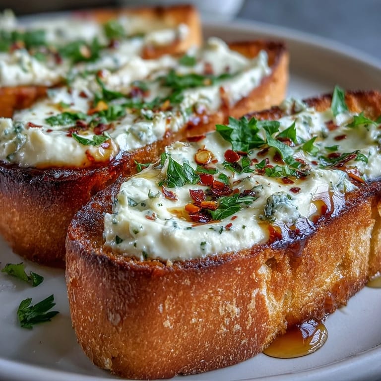 Save My friend texted me a photo of golden bread dripping with spicy honey at some restaurant in Brooklyn, and I spent the next hour trying to reverse-engineer it in my kitchen. The ricotta spread came together almost by accident—I was mixing soft butter with garlic and suddenly realized I had the perfect base for something creamy and luxurious. That first bite, still warm from the oven with the hot honey hitting the back of my throat, made me understand why she couldn't stop talking about it.