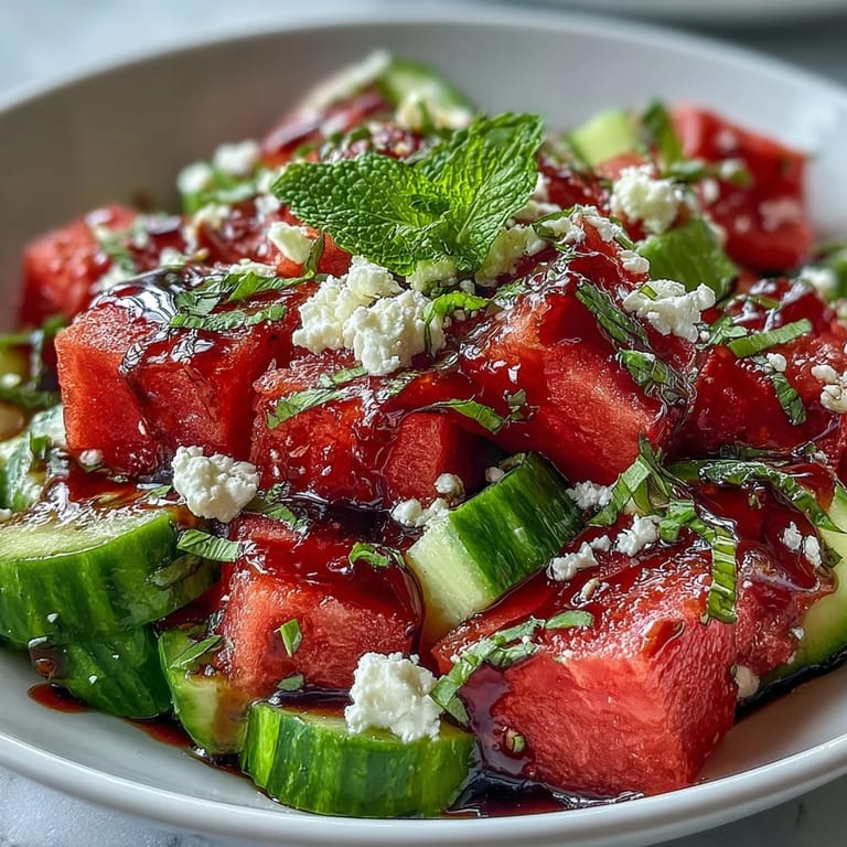 The beauty of this salad is that it's a template, not a prescription. I've thrown toasted pine nuts in there for crunch, added thinly sliced red onion for bite, swapped basil for mint when my mint plant got leggy, and even added a handful of arugula when I had it sitting around. The core—watermelon, cucumber, feta, and that balsamic glaze—that stays the same, but everything else is negotiable based on what's in your kitchen or what sounds good that day.